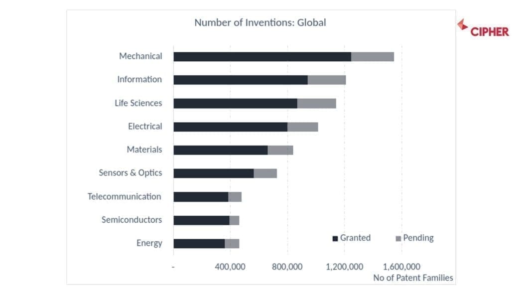 Using patent filings as an indicator of innovation, Life Sciences have published the most patents in the last three years – 550,000.